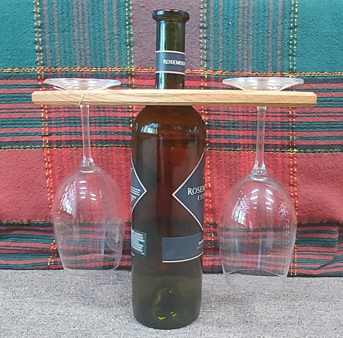 The perfect gift for any wine drinker. What better way to compliment a bottle of wine than a convenient way to share with a friend. This sturdy 2 Glass Caddy will hold 2 wine glasses when placed on the neck of the wine bottle. This particular Caddy is fashioned from Red Oak.