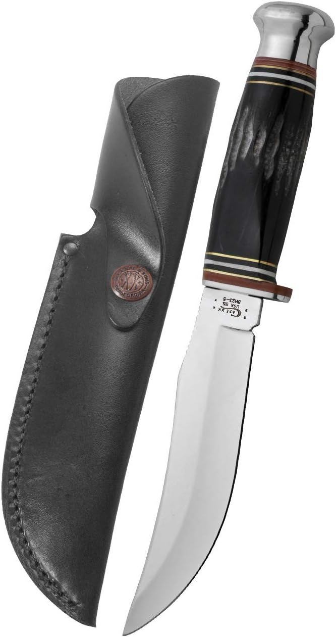 Hunter Fixed Swept Skinner Blade Knife with Black Buffalo Horn Handle. Features 10" (25.4cm) overall. 5" (12.7cm) stainless upswept skinner blade. Aluminum pommel. Black leather belt sheath. Boxed.