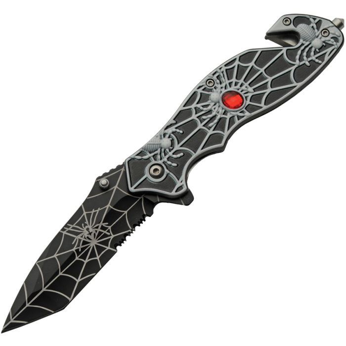 Assisted opening. 4.75" (12.07cm) closed. 3.75" (9.53cm) black finish partially serrated stainless tanto blade. Black ABS handle. Extended tang. Thumb stud. Glass breaker. Belt/cord cutter. Pocket clip. Spider web blade and handle artwork. Boxed.