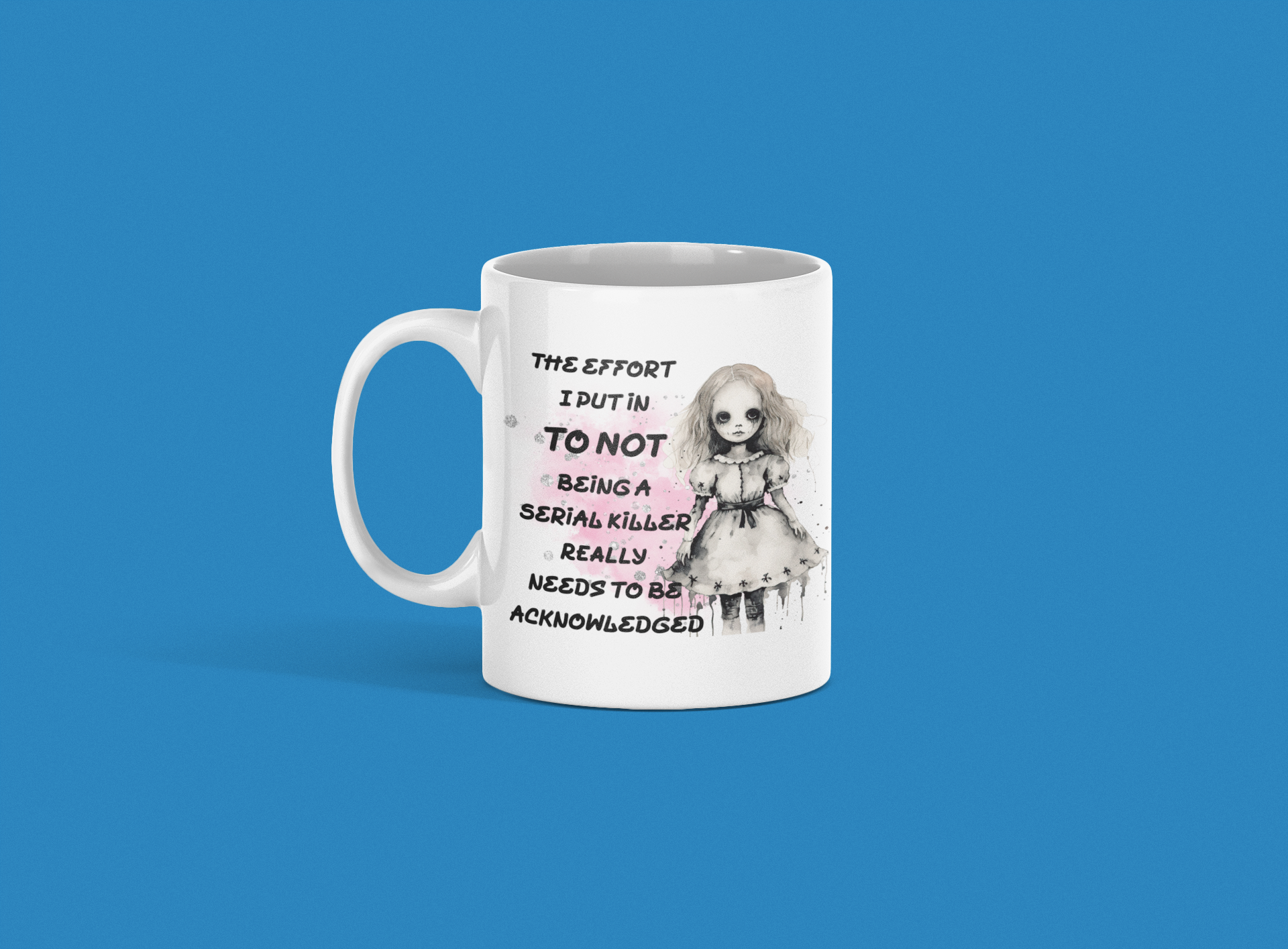 “The Effort I Put In” Creepy Doll Mug – Funny Halloween Coffee Mug (11oz)