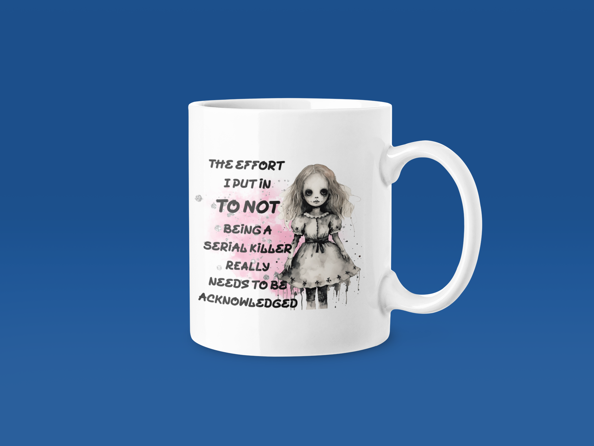 A little spooky, a little sassy, and just the right amount of unhinged energy for your morning brew. Our “The Effort I Put In to NOT Being a Serial Killer” Mug pairs eerie artwork of a creepy doll with a delightfully dark sense of humor — perfect for those days when caffeine is the only thing keeping you from committing a true crime of attitude.